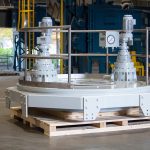 Our Pier-Mounted Dual Drive units are supported by a column in the center of the tank, and tank sizes typically range from 40 ft to 300 ft (12 m to 100 m) in diameter. They are often used on solid contact and flocculating clarifiers or softeners.